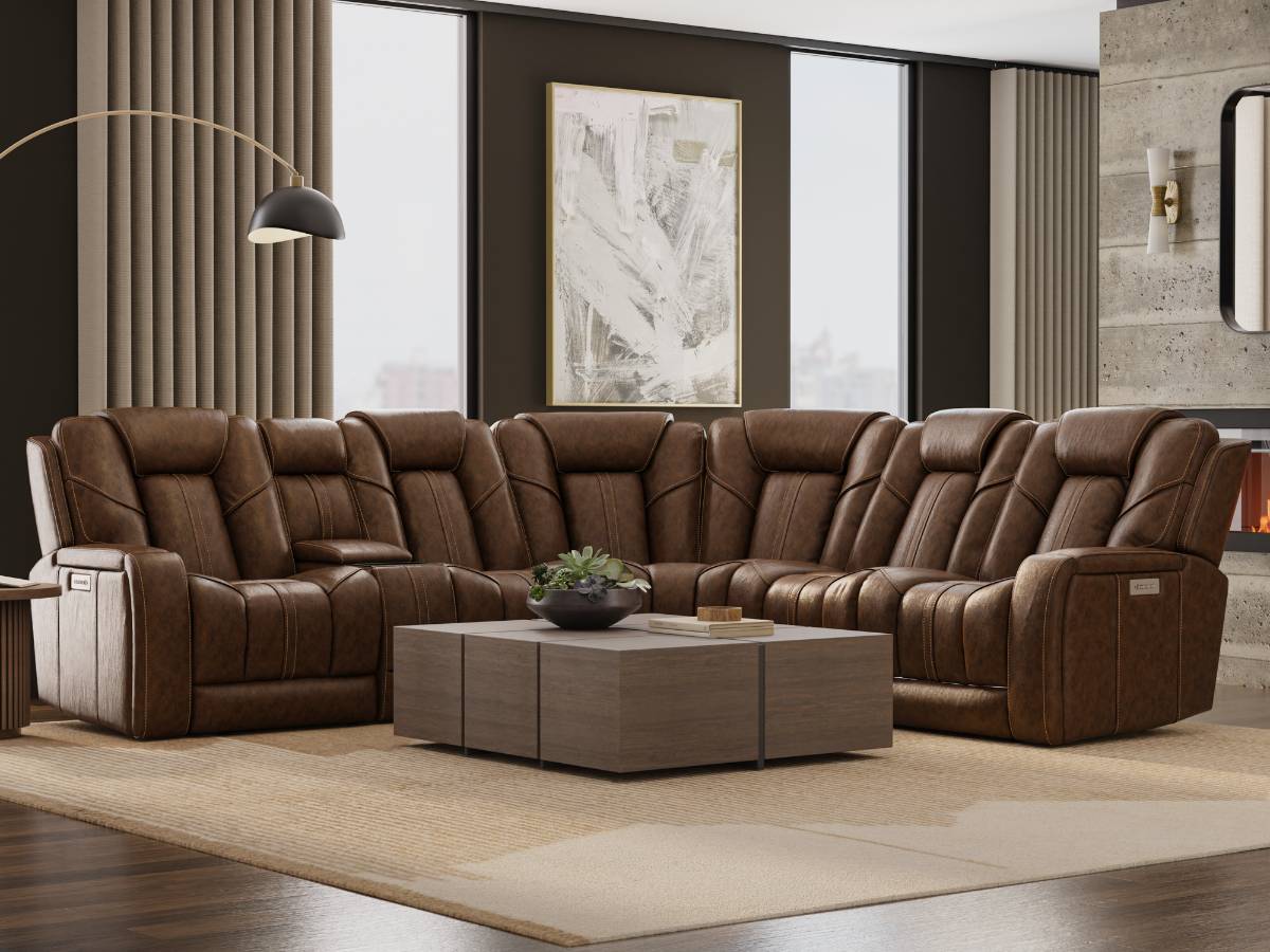 The Acoustic 6-Piece Audio Sectional takes your living room to the next level with unparalleled comfort and entertainment. Upholstered in a durable brown polyester microfiber, this sectional features Triple Power reclining for customized relaxation. Its standout feature is the full immersive audio system integrated into the media console, perfect for movie nights or music lovers. Designed with a steel seat box and a commercial-grade hardwood plywood frame, it’s built to last. The consoles include hidden cupholders, deep storage, wireless charging, and USB Type A & C ports, offering modern convenience at your fingertips. Stylish and functional, the Acoustic sectional is the ultimate choice for tech-savvy comfort.Read More