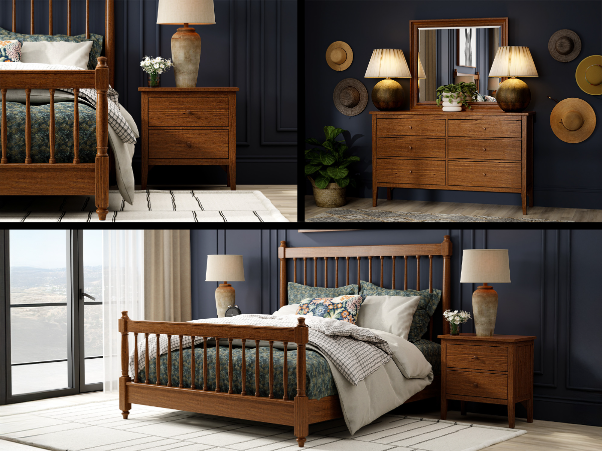 The Adams Bed brings timeless charm and traditional craftsmanship into your bedroom with its classic spindle design and warm bark finish. Made from solid pine, this bed is available in both king and queen sizes to suit your space. The natural light brown stain highlights the beauty of the wood grain, giving it a rustic yet refined appearance. Turned vertical posts on both the headboard and footboard add elegant detailing that feels rooted in heritage styling.