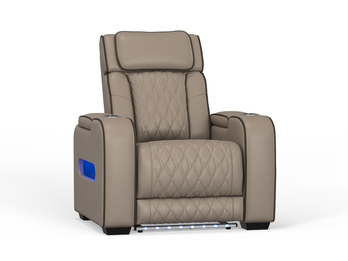 Packed with modern conveniences, the Alan Power Leather Recliner includes one-touch power controls with adjustable headrest and multiple reclining positions. Zero-draw USB ports keep your devices powered without wasting energy, while storage cubbies inside and on the outside of the arms keep essentials within reach. Built-in cupholders and ambient blue LED lighting enhance both function and style, creating the perfect atmosphere for movie nights or everyday lounging. With its premium materials and innovative features, the Alan Power Leather Recliner delivers comfort and performance in one sophisticated package.