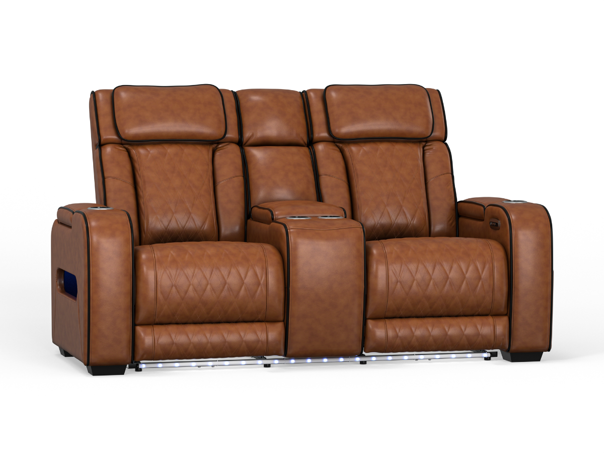 Designed with convenience in mind, the Alan Power Leather Loveseat includes a center storage console with cupholders, plus storage cubbies in the arms to keep essentials close at hand. One-touch power controls with adjustable positions and headrests allow you to personalize your comfort, while zero-draw USB ports make charging devices effortless. Ambient blue LED lighting adds a modern glow that enhances the overall atmosphere. With its combination of premium leather, advanced functionality, and thoughtful storage, the Alan Power Leather Loveseat offers luxury and practicality in equal measure.