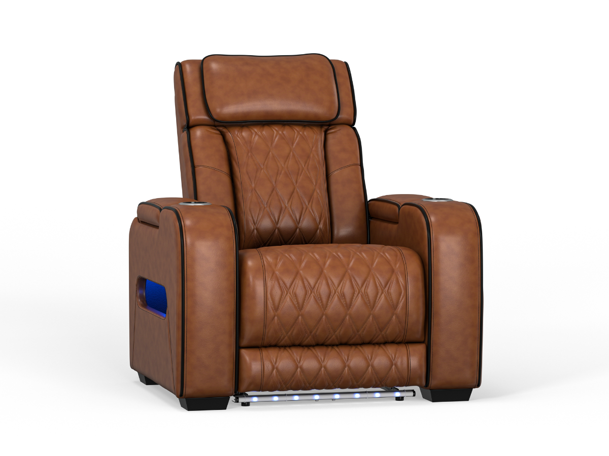Packed with modern conveniences, the Alan Power Leather Recliner includes one-touch power controls with adjustable headrest and multiple reclining positions. Zero-draw USB ports keep your devices powered without wasting energy, while storage cubbies inside and on the outside of the arms keep essentials within reach. Built-in cupholders and ambient blue LED lighting enhance both function and style, creating the perfect atmosphere for movie nights or everyday lounging. With its premium materials and innovative features, the Alan Power Leather Recliner delivers comfort and performance in one sophisticated package.