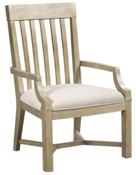 The James Arm Chair from the Litchfield collection by American Drew features a slat back will fit nicely with any of the dining tables. Upholstered seat in an ivory fabric and chair is finished in a beautiful driftwood finish.Read More