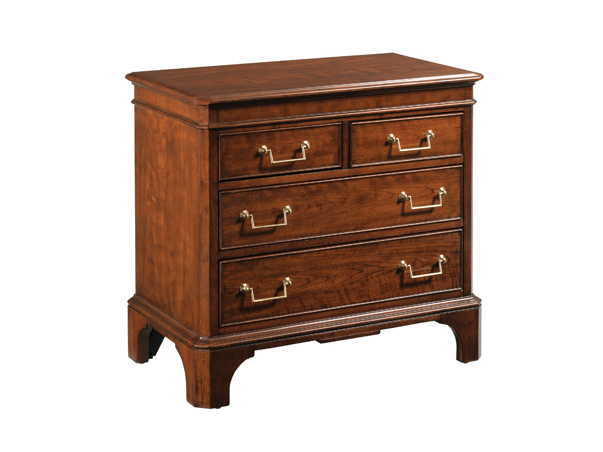 The Artesian Bedside Chest combines antique elegance with modern functionality, making it a perfect addition to your bedroom. Crafted from rich cherry and walnut veneers, this chest showcases a prominent wood grain and timeless styling. The chest features four drawers: two smaller ones at the top for easy access to smaller items, and two larger drawers below for more substantial storage needs. The bottom drawer is cedar-lined, providing an ideal space for delicate items or linens. Finished with elegant gold hardware, the chest exudes sophistication and charm. For added convenience, the bedside chest includes a built-in power management system with two outlets and USB ports, ensuring your devices are always within reach and charged. The Artesian Bedside Chest seamlessly combines beauty and practicality to enhance your bedroom space.