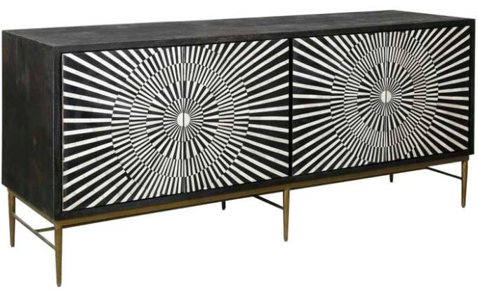 The Talley Server is a true testament to modern Boho design, drawing inspiration from a captivating blend of contrasting elements. Its four doors, adorned with alternating white and black stained bone and resin, come together to create a striking sunburst pattern.Read More