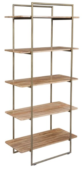 Modern design in a warm, moody color palette. The iron frame, finished in antique brass, supports five open shelves. The solid mango shelves are adorned with v-grooves for a charming planked effect. The open shelving adds an airy lightness to the modern style of the Etagere.Read More