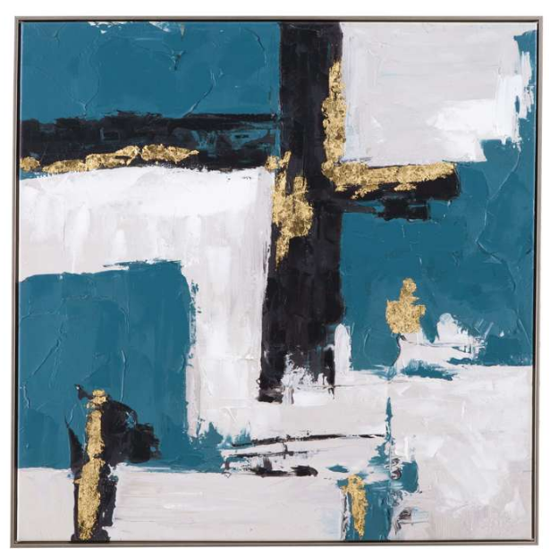 The Around About Framed Canvas features a contemporary abstract design with rich teal tones, accented by bold strokes of black and pops of gold. The vibrant colors and dynamic composition create an engaging focal point for any space.Read More