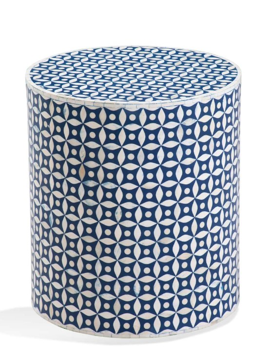 This round accent table features a white and blue diamond pattern