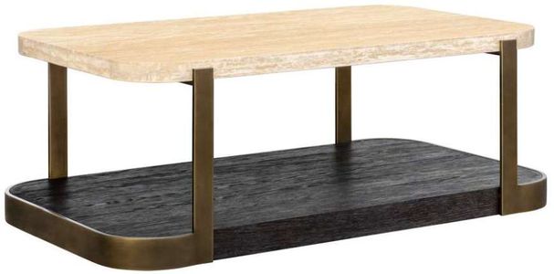 The Avalon cocktail table embodies a seamless blend of modern and contemporary elements, exuding sophistication and timeless elegance. Crafted with a trio of mixed materials, including beige travertine stone for the top, a bronze-finished metal frame, and an espresso oak-finished bottom shelf, this piece adds a touch of luxury to any space.Read More