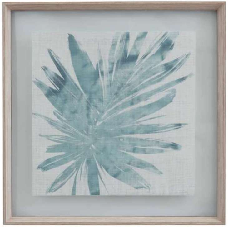 Burlap Ocean Palm llI is a straight cut print floating in clear glass surrounded by a 7/8" weathered washed frame