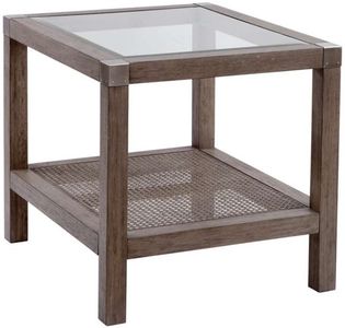 Introducing the Calumn end table, inspired by coastal farmhouse aesthetics. Crafted from solid wire brushed rubberwood, it features clear tempered glass inset tops and charming cane inserts in the base. The neutral driftwood finish, complemented by brushed nickel corner cap detailing, brings tranquility to your space.Read More