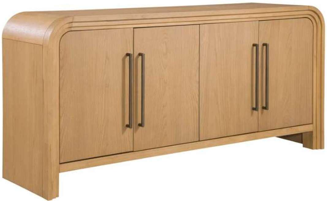 The Chandler Sideboard is crafted with solid wood and flat-cut oak veneers in a light oak finish. Its modern design boasts smooth, rounded edges and step-molding detailing. The four doors feature oversized antique brass handles, concealing adjustable shelves with media cord management.Read More