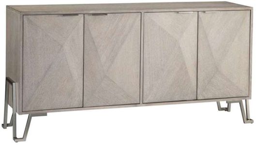 The Cooper server features a modern transitional design enhanced by raised angular door fronts with veneers in alternating directions. The base hugs the sides of the case frame and is in brushed nickel with coordinating tab pulls. This server offers two adjustable shelves and media cord management.Read More