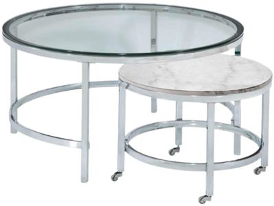 The Jadyn round cocktail features a cocktail with a clear glass top and a nesting table with a solid stone top and piano casters. Add elegance to your room by adding this end table.Read More