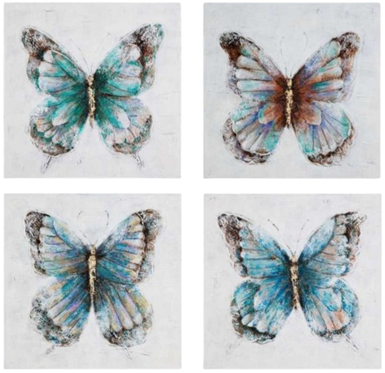 This chic four piece set displays the unique beauty of each butterfly. The metallic finish and blue undertones of this set go well with the surrounding decor of any space in need of natural beauty and a touch of shine. Since every pieces is hand painted.Read More