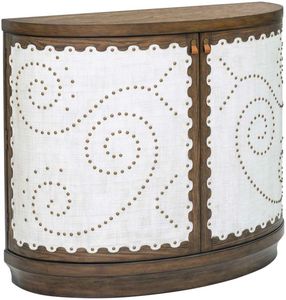 The framed doors are wrapped in a neutral linen-like fabric, featuring a distinctive brass nail head pattern for added texture and detail. Leather-like pulls complete the look, and behind the doors, you'll find adjustable shelving for added versatility and function.