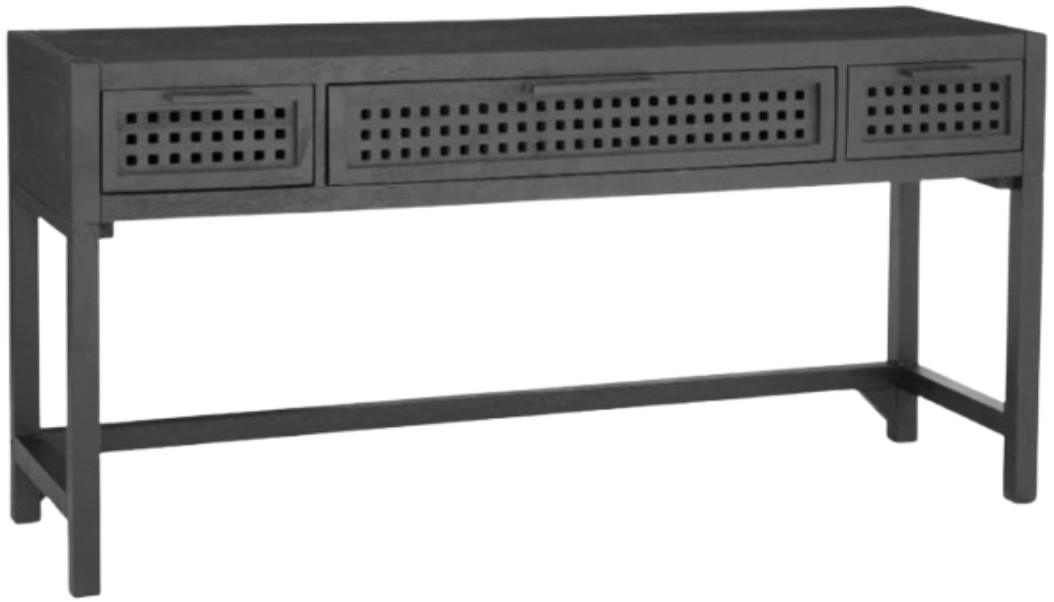 The Pentak Console has three drawers accented with an open pierced fretwork detailing. Matte black iron bar pull hardware. Update your space with style and functionality by incorporating this console into your home office or living room.Read More