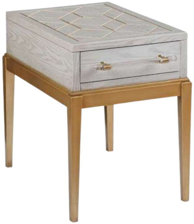 The Perrine Chairside Table will make the perfect addition for your home. The gold legs pop against the soft graphite gray table top. The top is accented with antique gold geometric inlay design, and custom acrylic hardware for the draw pulls.Read More