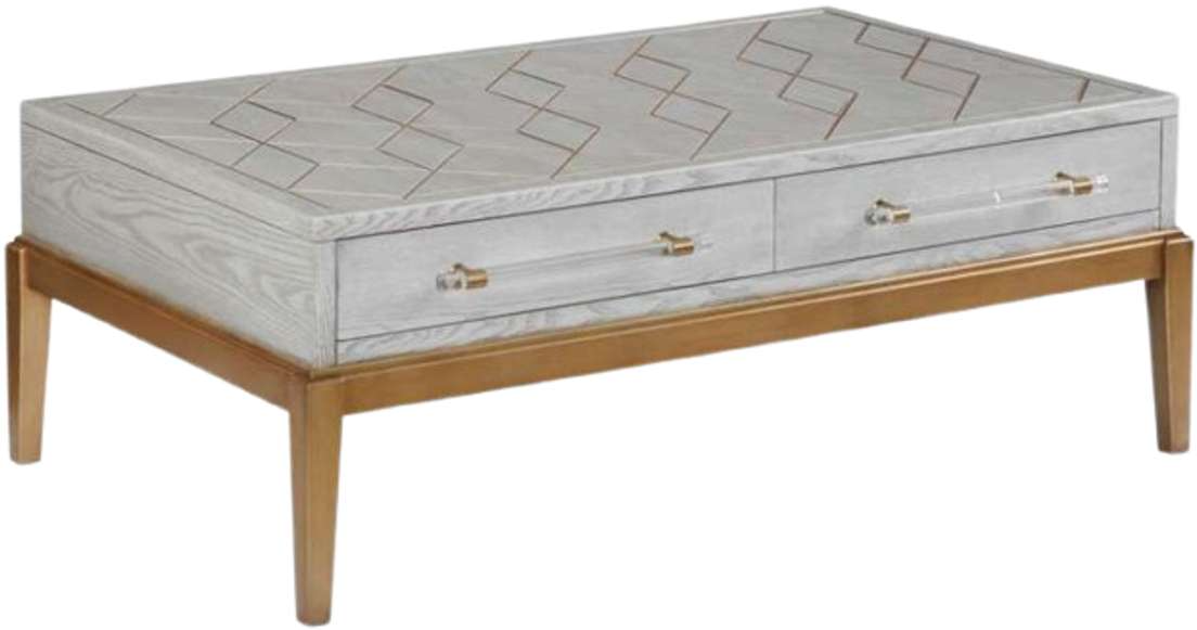 The Perrine Rectangular Cocktail Table will make the perfect centerpiece for your living room. The gold legs pop against the soft graphite gray table top. The top is accented with antique gold geometric inlay design, and custom acrylic hardware for the two draw pulls.Read More