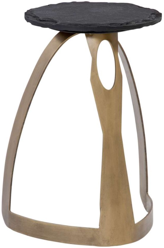 The Vaughan Accent Table displays a modern styling, architectural inspired solid iron base in an antique brass finish, sandblasted black slate top with natural edges.Read More