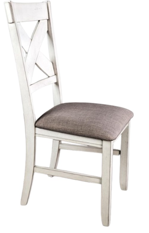 The simple farmhouse style of this X-back dining side chair gives it instant character for your home's dining space. It is shown in a grey fabric seat with an antique white back and legs.Read More