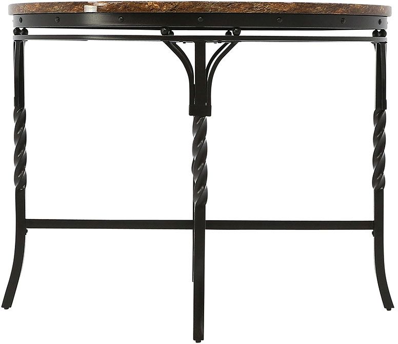 Bring a slice of Italy with this classically styled round table to your kitchen or dining nook. It features a faux marble top and metal frame in dark bronze finish with twisted metal legs. For charming fashion, the metal dining side chairs have a traditional back scroll detail.Read More