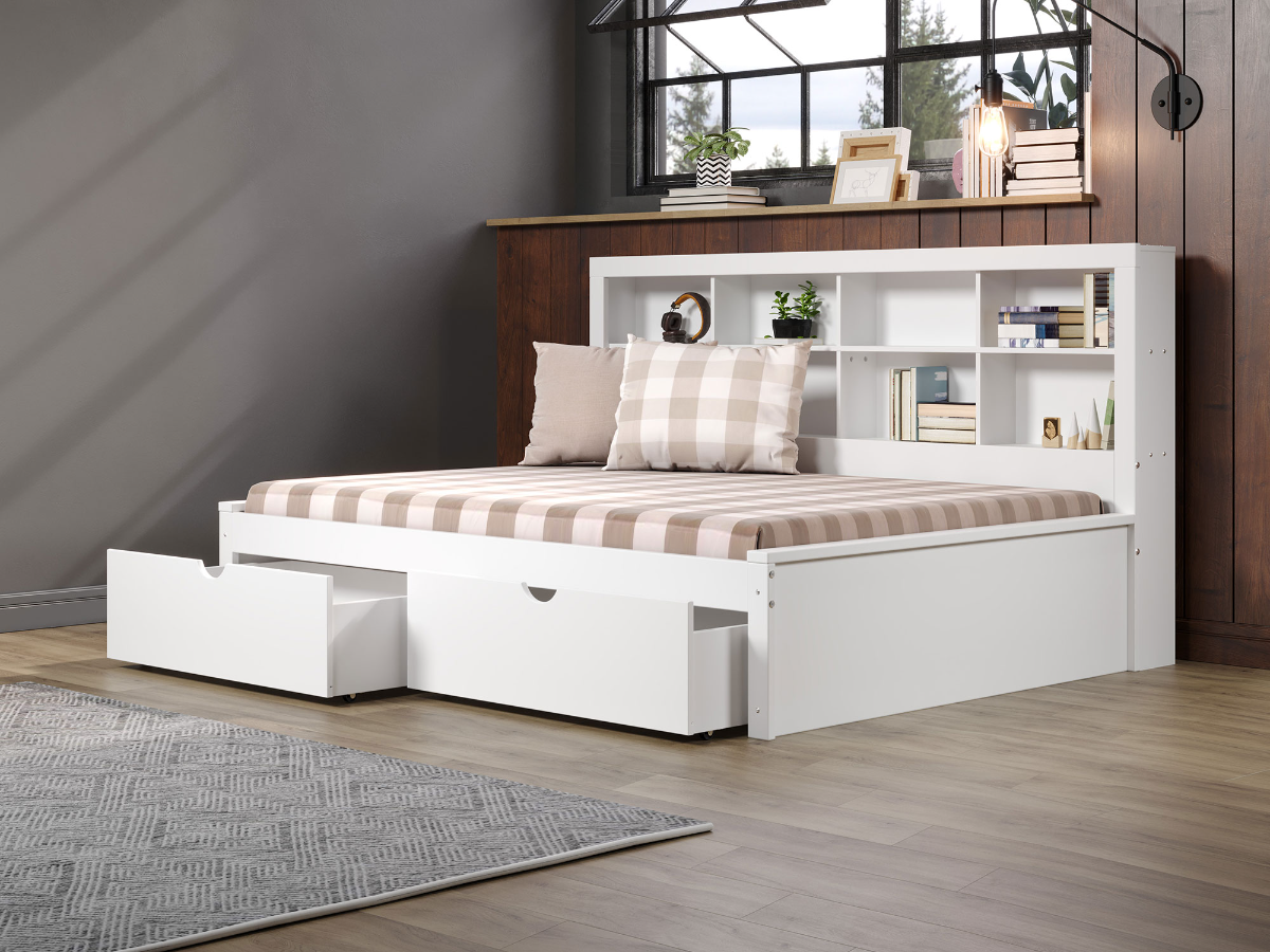 The Carter White Full Bed is a practical and stylish furniture piece that is perfect for a child's bedroom or guest room. The bed features two drawers under the bed for storage, providing a convenient place to store clothing or extra bedding. In addition, the bed also includes a built-in bookcase, allowing you to store books and other items close at hand. The bed has a crisp white finish, making it a versatile addition to any decor. The Carter White Full Bed is a great choice for those who want both functionality and style in their furniture.