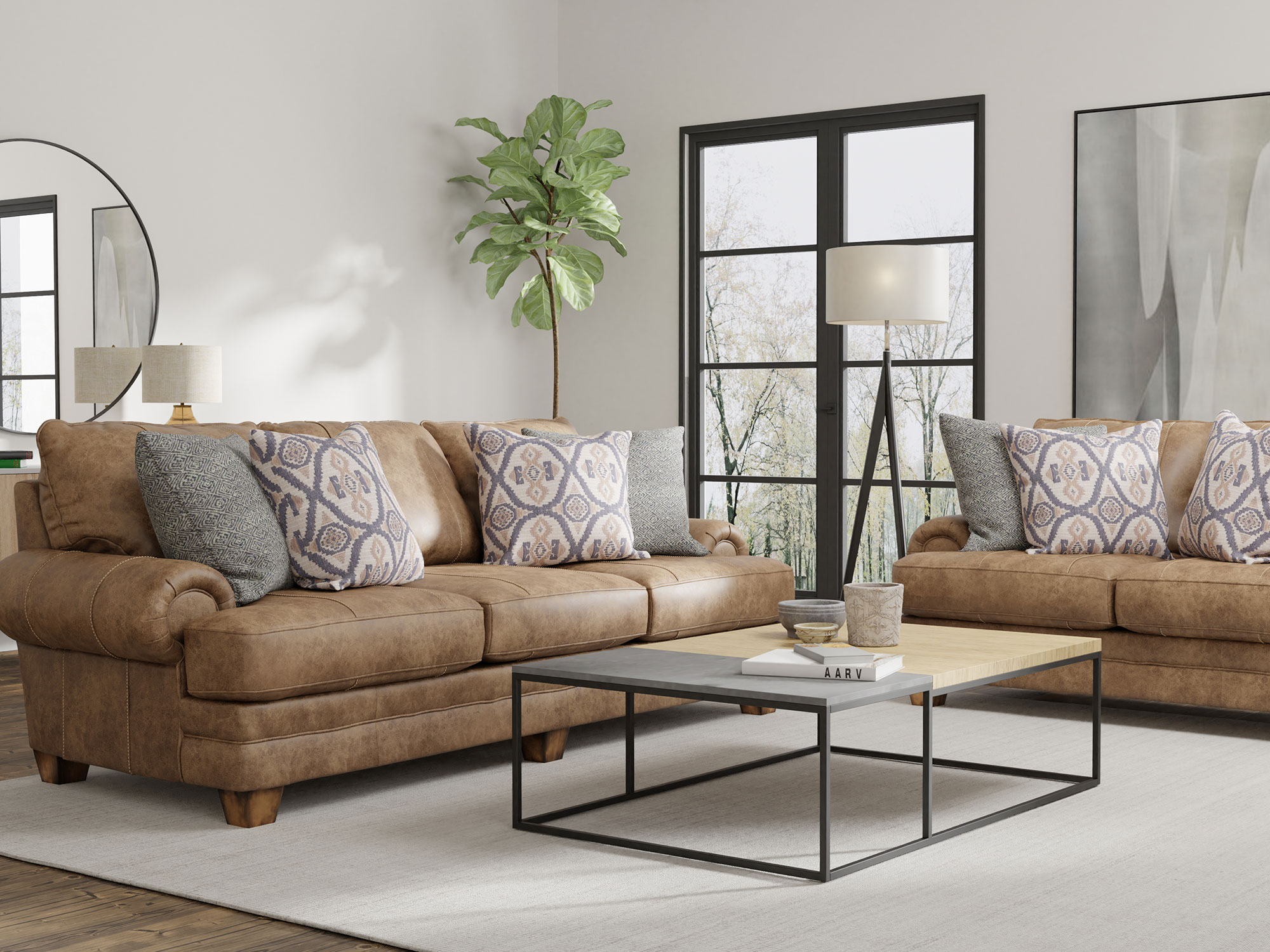 Create a warm and inviting living room with the Cecilia Sofa and Loveseat ensemble. The light brown upholstered stationary sofa and loveseat feature a large-scale design with deep cushions and overstuffed backs, offering a comfortable and luxurious seating experience. Solid wooden legs and padded inset roll arms with pleated edges add a touch of sophistication to the ensemble. The Cecilia Sofa and Loveseat combination provides ample seating for family and guests, making it perfect for gatherings or quiet evenings at home. The cohesive design ensures a harmonious look in your living space, creating a welcoming atmosphere. Elevate your living room with the timeless and comfortable Cecilia Sofa and Loveseat, where style meets relaxation for a truly enjoyable home experience.