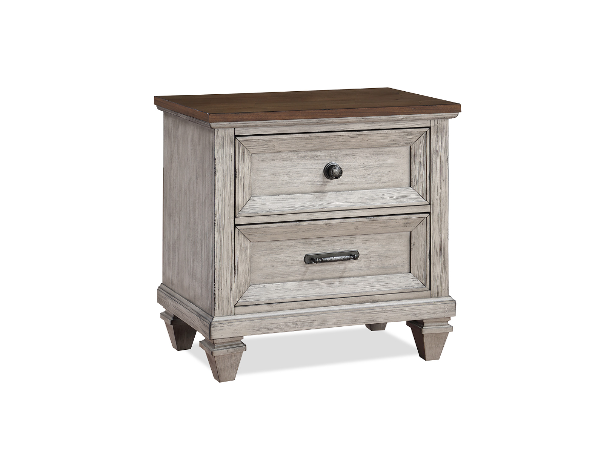 Add a touch of elegance and functionality to your bedroom sanctuary with the Clark Nightstand. Its Vintage Creme finish, adorned with a rich brown top, exudes timeless beauty while seamlessly complementing your decor. This two-drawer nightstand not only offers ample storage space but also showcases impeccable craftsmanship. The drawers, featuring ball bearing glides and English dovetail construction, ensure smooth operation and enduring durability. Modern convenience meets classic design with integrated USB ports, allowing you to charge your devices conveniently within arm's reach. The Clark Nightstand embodies a harmonious blend of sophistication and practicality, making it an essential addition to your space. Experience the allure of quality craftsmanship and tasteful aesthetics, all encapsulated within the Clark Nightstand.Read More