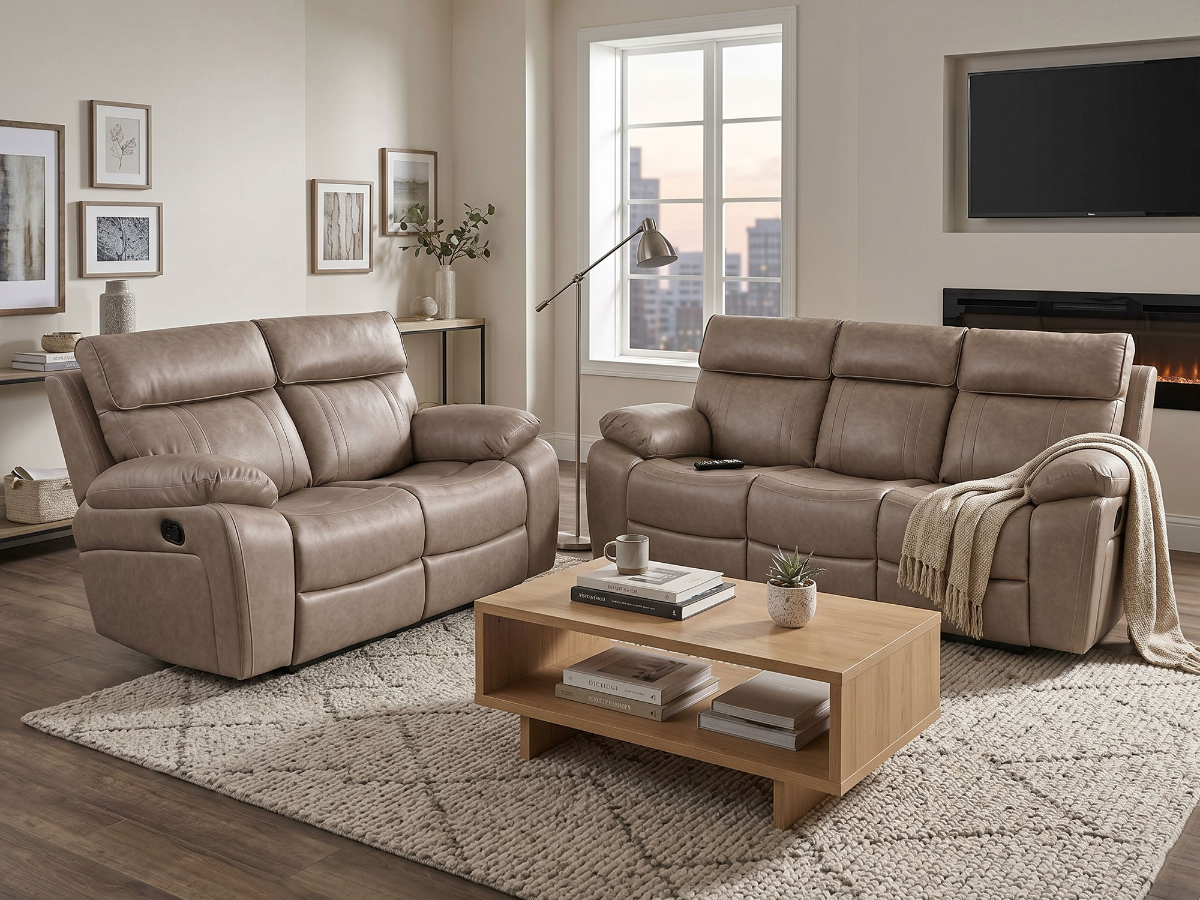 Both pieces feature contoured bucket seating that provides body-conforming comfort, along with bustle-back pillow headrests for added neck and head support. Plush, fully padded arms enhance the lounging experience, while the durable polyester-synthetic upholstery offers the look of buffed leather with easy maintenance. The sofa includes a convenient dropdown table with two cupholders and a built-in power outlet featuring USB Type A and C ports, perfect for keeping devices charged and essentials within reach. Manual reclining mechanisms with pull tab release allow for smooth extension of the footrests, making it easy to unwind. Designed with attached back cushions and generous dimensions, this set delivers comfort, functionality, and style in one complete package.