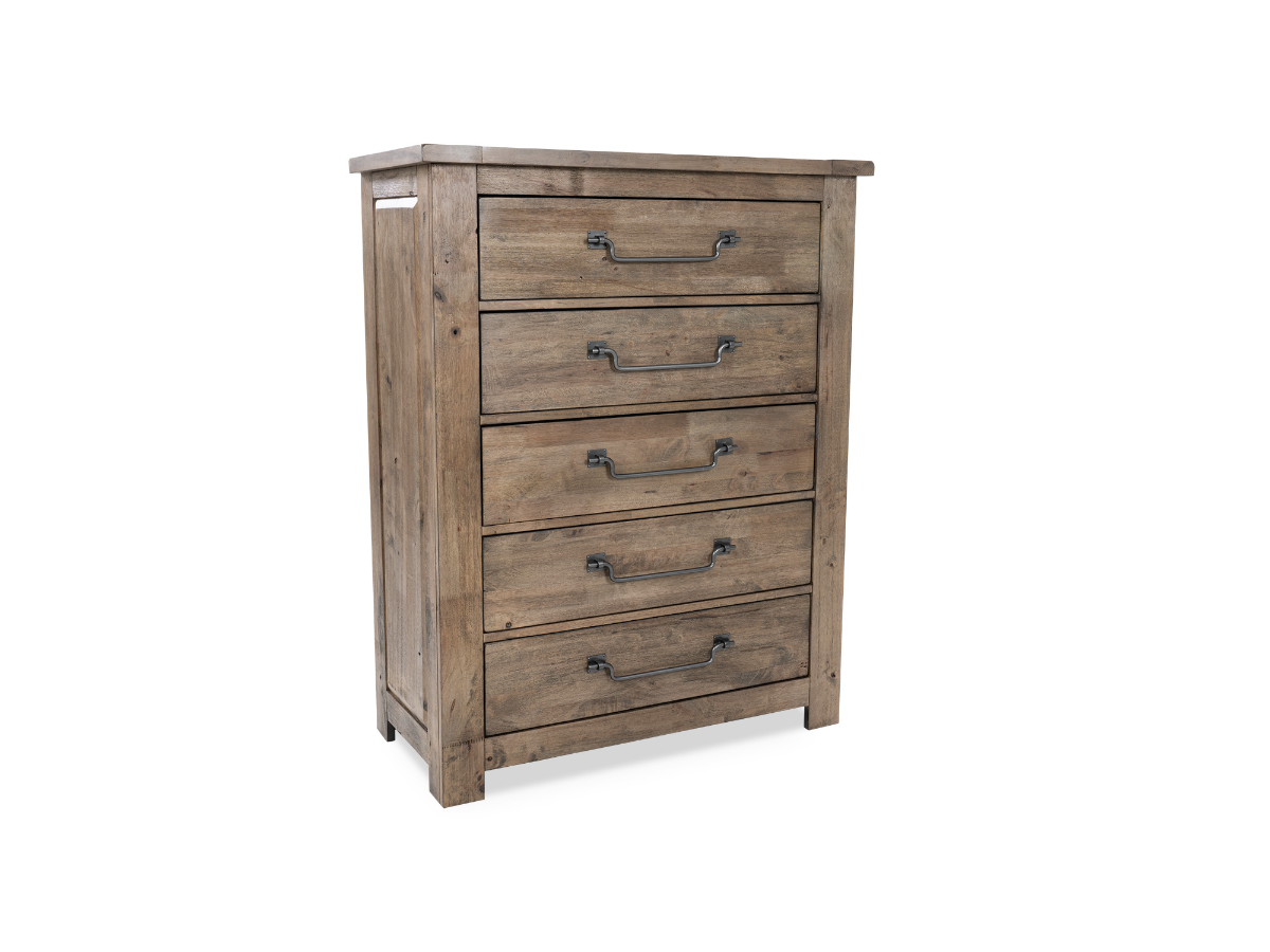 Enhance your bedroom storage with the charming Cooper Chest. Crafted in a farmhouse style, this chest features five spacious drawers, providing ample space to organize and store your belongings. The rich brown wood finish adds a warm and inviting touch to your space, while the rustic planked accents on the front give it a distinctive farmhouse appeal. The sturdy construction ensures durability, making it a lasting addition to your bedroom ensemble. With its blend of functionality and rustic charm, the Cooper Chest offers both style and practicality, making it a perfect choice for any farmhouse-inspired bedroom.