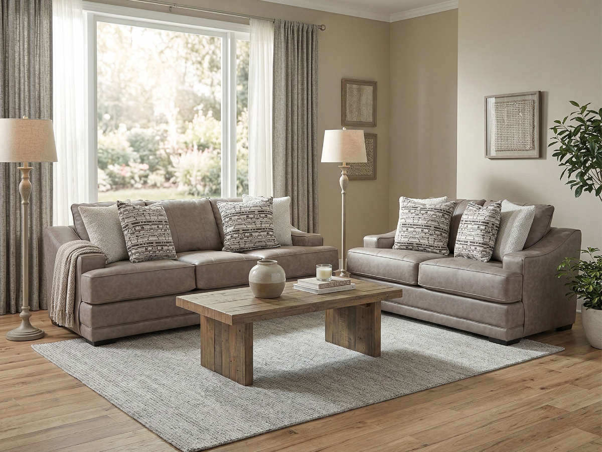 Includes sofa and loveseat in leather-look taupe gray-brown fabric