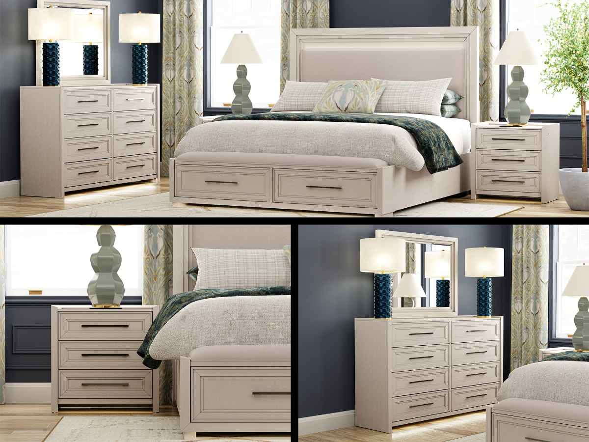 The included dresser and mirror provide generous storage with eight drawers, including felt-lined top drawers, cedar-lined bottom drawers, and built-in jewelry trays. The nightstand features three drawers, wireless charging, USB Type A & C ports, and a soft-touch activated light underneath. Matching silver hardware adds a sleek contrast to the ivory finish, and integrated touch lighting across the pieces adds both functionality and ambiance. As an added bonus, the queen-size set includes a free mattress, making the Council Bedroom Set a complete solution for both style and comfort.