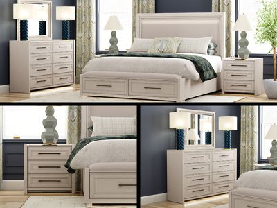 The Council Bedroom Set brings together sleek sophistication and smart features in a cohesive collection designed to elevate your space. Available in king or queen sizes, the set includes the Council Bed with an upholstered headboard and matching bench-style footboard featuring two storage drawers. A soft brushed white finish over rubberwood solids and straight grain oak veneers highlights the clean lines and subtle texture throughout each piece, offering a serene and polished look for modern and transitional spaces.Read More