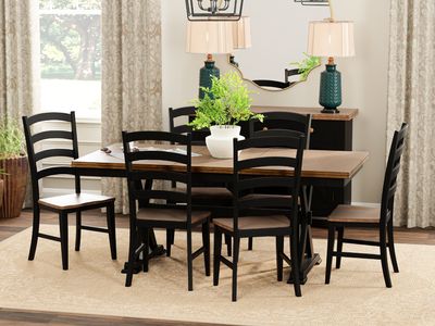 The County Dining Set brings timeless farmhouse charm and lasting durability to your home with a full dining solution ready for everyday meals or special gatherings. This set includes the County Dining Table with its two-tone design, featuring a rich brown tabletop and black painted base with x-framed supports for added rustic character. Made from solid Asian hardwood and kiln-dried to resist warping and cracking, the table also includes a built-in 18-inch leaf that folds underneath, making it easy to expand when needed.Read More