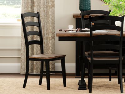 The County Side Chair brings classic farmhouse charm and solid craftsmanship to your dining space. Featuring a traditional ladder back design in a slate black finish, this dining chair is paired with a contrasting light brown seat for a warm, two-tone look. Crafted from solid rubberwood, the chair offers both durability and timeless appeal, making it a perfect match for rustic, cottage, or transitional dining rooms.Read More