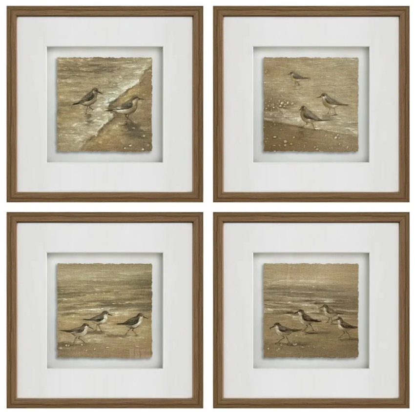 Collier by crestview collection is a set of four artworks capturing seagulls strolling along the beach in sepia tones on torn-edge linen. A white mounting board under clear glass and a natural wood frame complete the nostalgic, coastal-inspired design.Read More