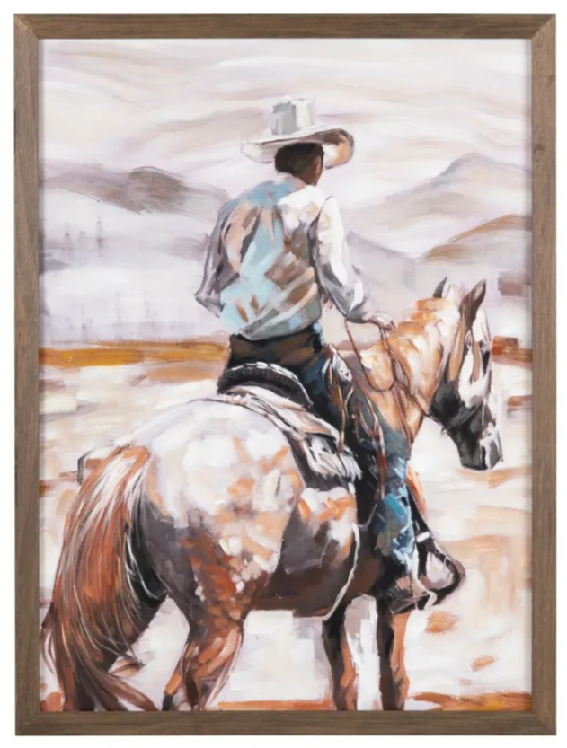 Horseback wall decor by crestview collection is a hand-painted canvas depicting a cowboy riding through a rugged western landscape. Rendered in rich browns and grays, this striking piece is framed in natural wood, blending adventure, rustic charm, and artistry for timeless appeal.Read More