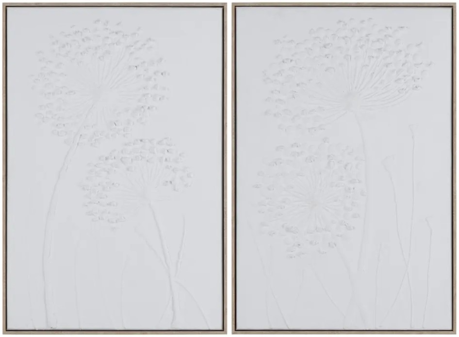 Lawrence wall art set by crestview collection includes two hand-embellished paintings featuring textured white dandelion motifs. Framed in natural wood, this contemporary duo seamlessly blends simplicity with organic charm, making it perfect for adding modern elegance to any space.Read More