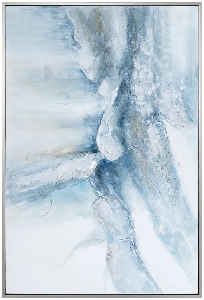 Lucie wall art by crestview collection is an abstract piece in layered blue, white, and gray hues. With rich texture, dynamic movement, and a silver metallic frame, it adds sophistication and depth, making it a striking focal point in modern spaces.Read More