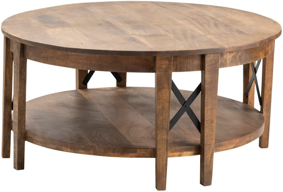 The Crestview Collection Sutton Creek Cocktail Table has a sturdy, wooden construction that makes the perfect centerpiece for your living room. A warm, medium-brown finish is enhanced by black accents. The round table top has four legs, each with a black metal X in the middle.Read More