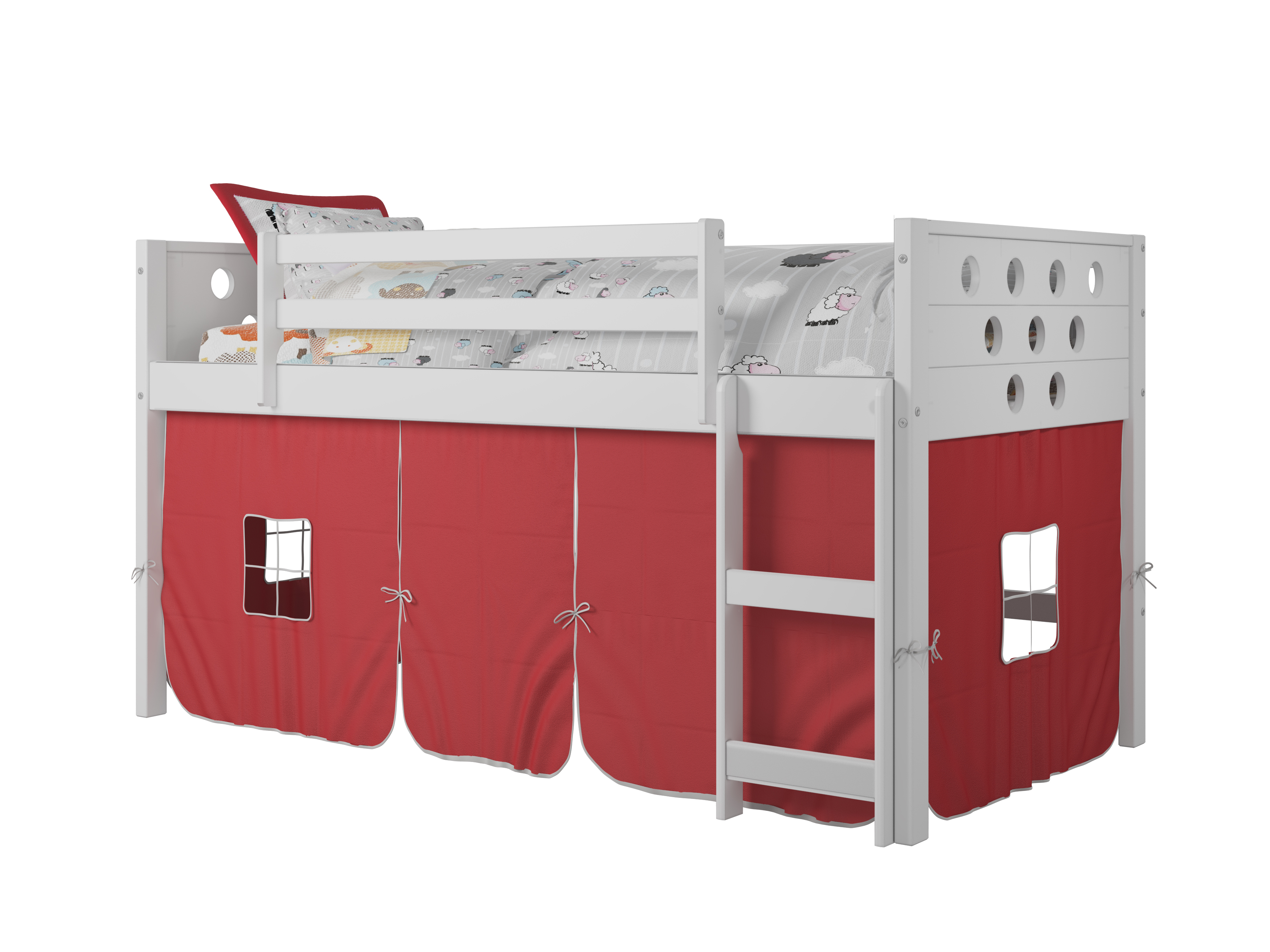 Circles low loft bed makes a small room fun, with large under bed area for storage or play. The Circles design can make a room easy to decorate and give it a warm inviting look. Red tent fabric makes a fun play area or the area below bed can be used to store things and Red tent covers them up.Read More