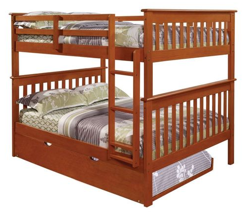 Our Full Over Full Mission style bunk bed with Espresso finish will add warmth to any bedroom. This bed comes with a mattress-ready slat system, so no Bunkie board is required. The included twin roll-out trundle is great for sleepovers or just keeping the clutter out from under the bed.Read More