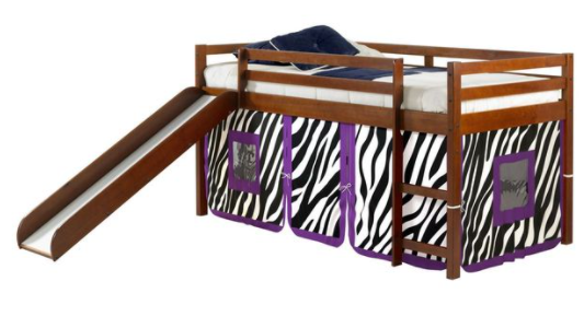 Transition your child from a toddler bed to an exciting twin low loft bed. The included slide makes it fun to get up in the morning. The warm light Espresso finish can easily match almost any decor. The zebra tent fabric can make for a fun indoor tent area or hide all the stored items under the bed.Read More