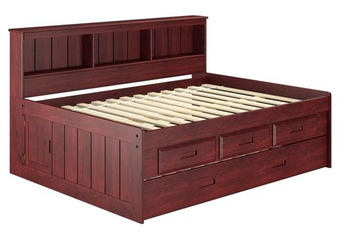 Our Full Daybed with a built-in bookcase is perfect for your growing child. The merlot finish pairs well with any decor. This stylish bed is perfect for maximizing space and keeping the room tidy. Also included are 3-drawer storage and a twin trundle for additional space-saving options.Read More