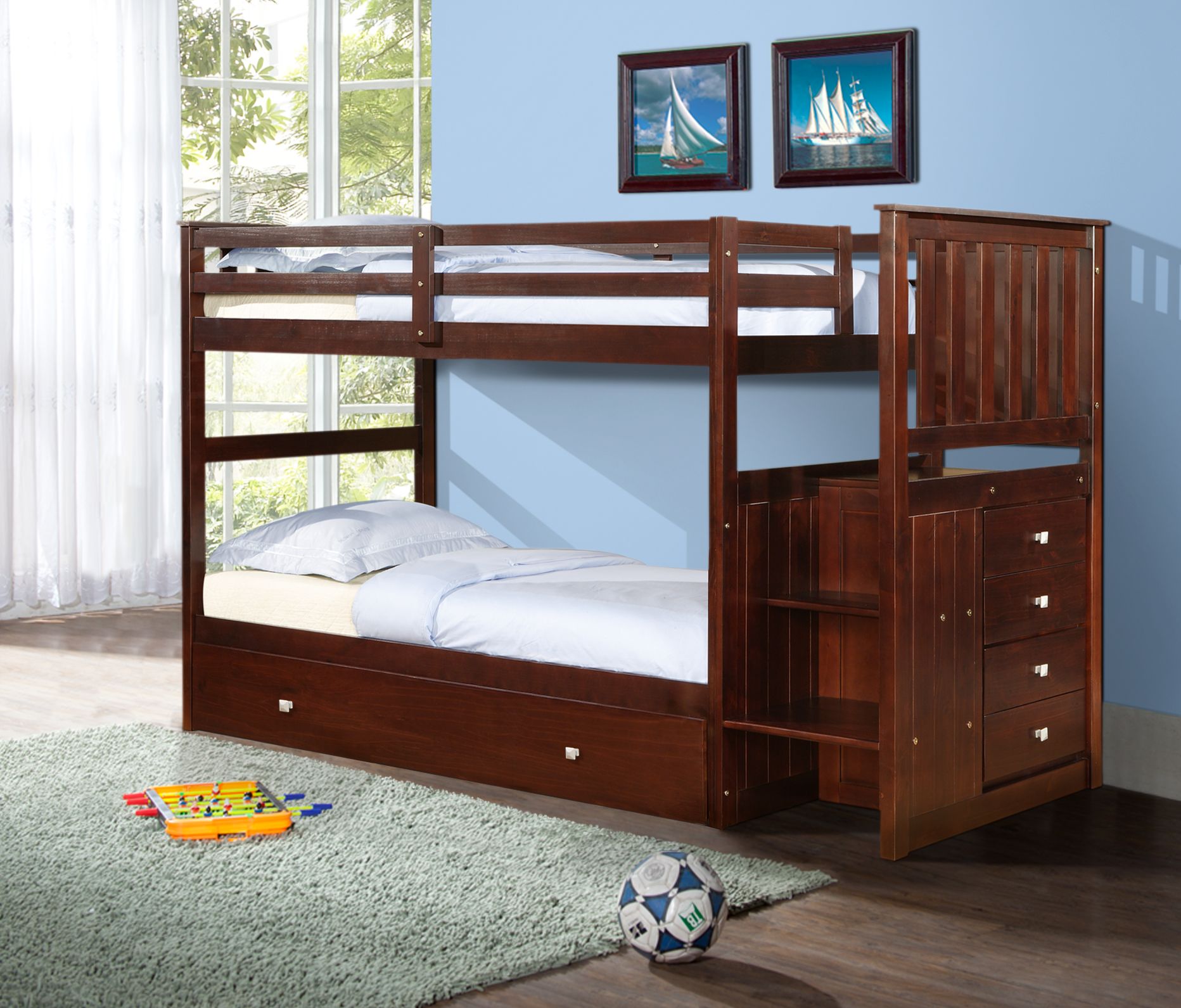 The twin over twin Mission stairway bunk bed adds a warm look to any bedroom with the Mission headboard panels and warm cappuccino finish. The 4-drawer chest is a perfect space saver in any room and can be assembled on either end. The twin roll out trundle is perfect for overnight guests.Read More