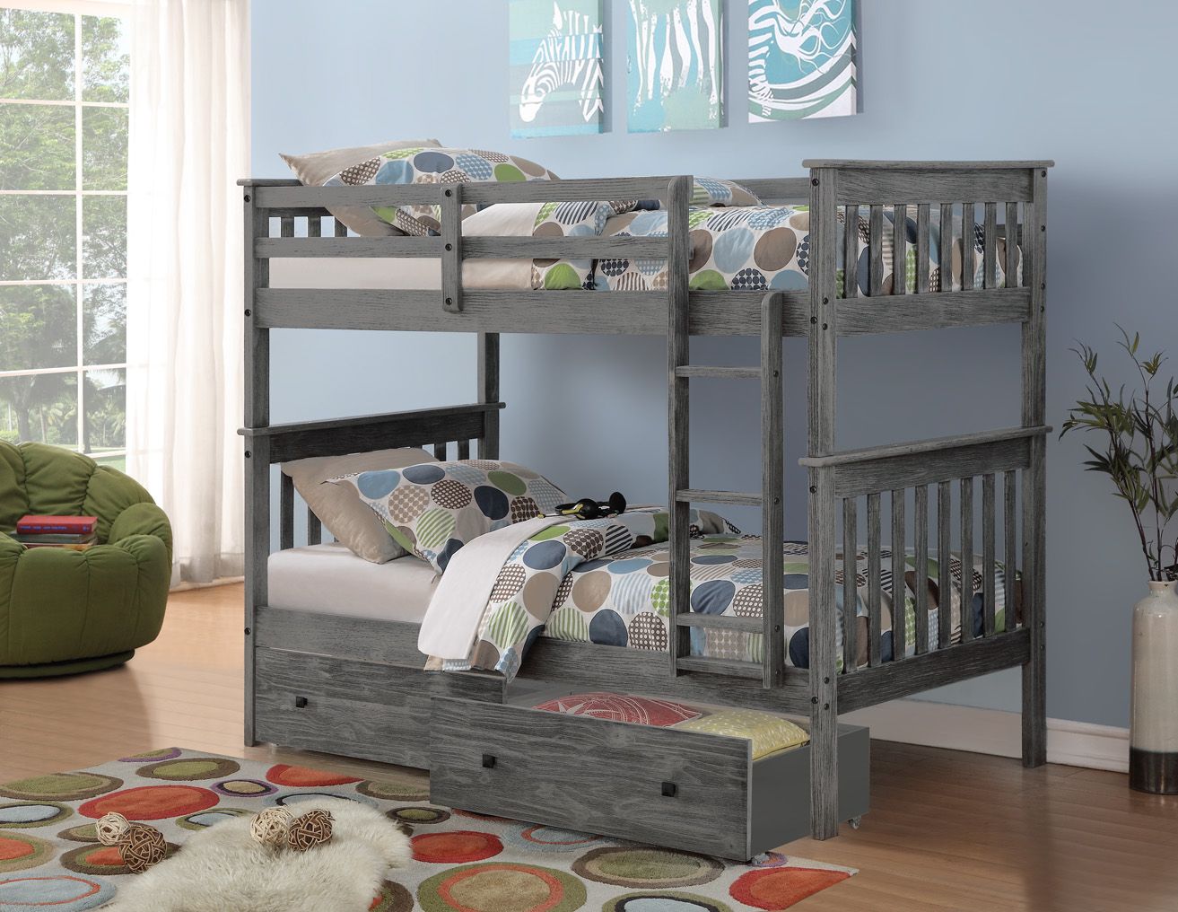 With a sturdy construction and brushed grey finish, this stately piece is great for any children's room. The attached ladder gives you easy access to the top bunk. Our mattress ready slat system is already incorporated, eliminating the need for box springs. Also included is a twin trundle bed for additional sleeping options.Read More