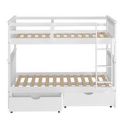 With a sturdy construction and white finish, this stately piece is great for any children's room. The attached ladder gives you easy access to the top bunk. Our mattress ready slat system is already incorporated, eliminating the need for box springs. Also included is a twin trundle bed for additional sleeping options.Read More