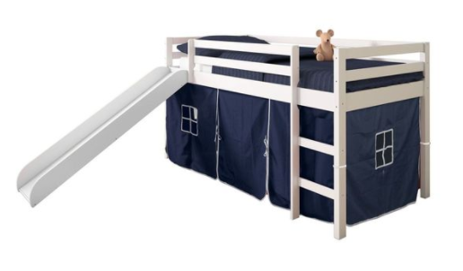 Transition your child from a toddler bed to an exciting twin low loft bed. The included slide makes it fun to get up in the morning. The warm light Espresso finish can easily match almost any decor. The bed is a great space saver in any child's bedroom, with a play area under the bed or open storage area. The blue tent fabric can make for a fun indoor tent area or find all the stored items under the bed.Read More