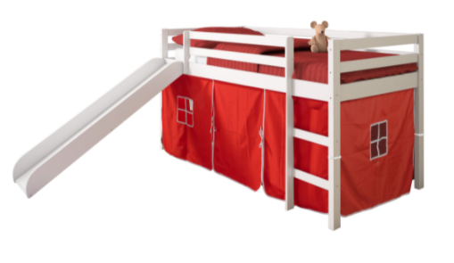 Transition your child from a toddler bed to an exciting twin low loft bed. The included slide makes it fun to get up in the morning. The warm light Espresso finish can easily match almost any decor. The bed is a great space saver in any child's bedroom, with a play area under the bed or open storage area. The red tent fabric can make for a fun indoor tent area or find all the stored items under the bed.Read More