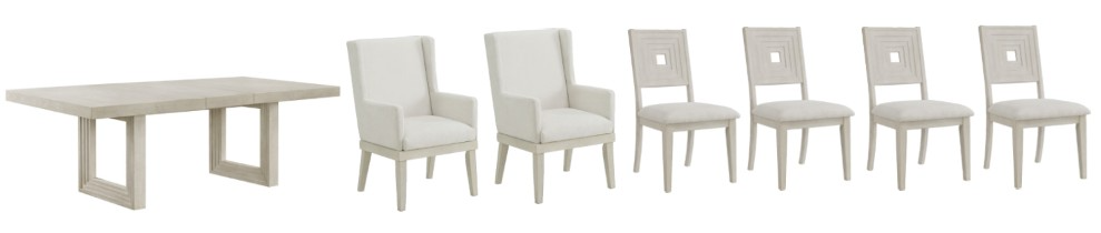 The double U-shaped base offers stability and style, complemented by chairs featuring a center square cut-out on the back for added flair. Arm chairs with abbreviated wings add a touch of luxury and comfort to your dining experience. Enjoy plush foam seating and soft, light upholstery, perfect for long dinners and lively conversations. Ideal for both everyday meals and special occasions, elevate your dining space with this exquisite set.